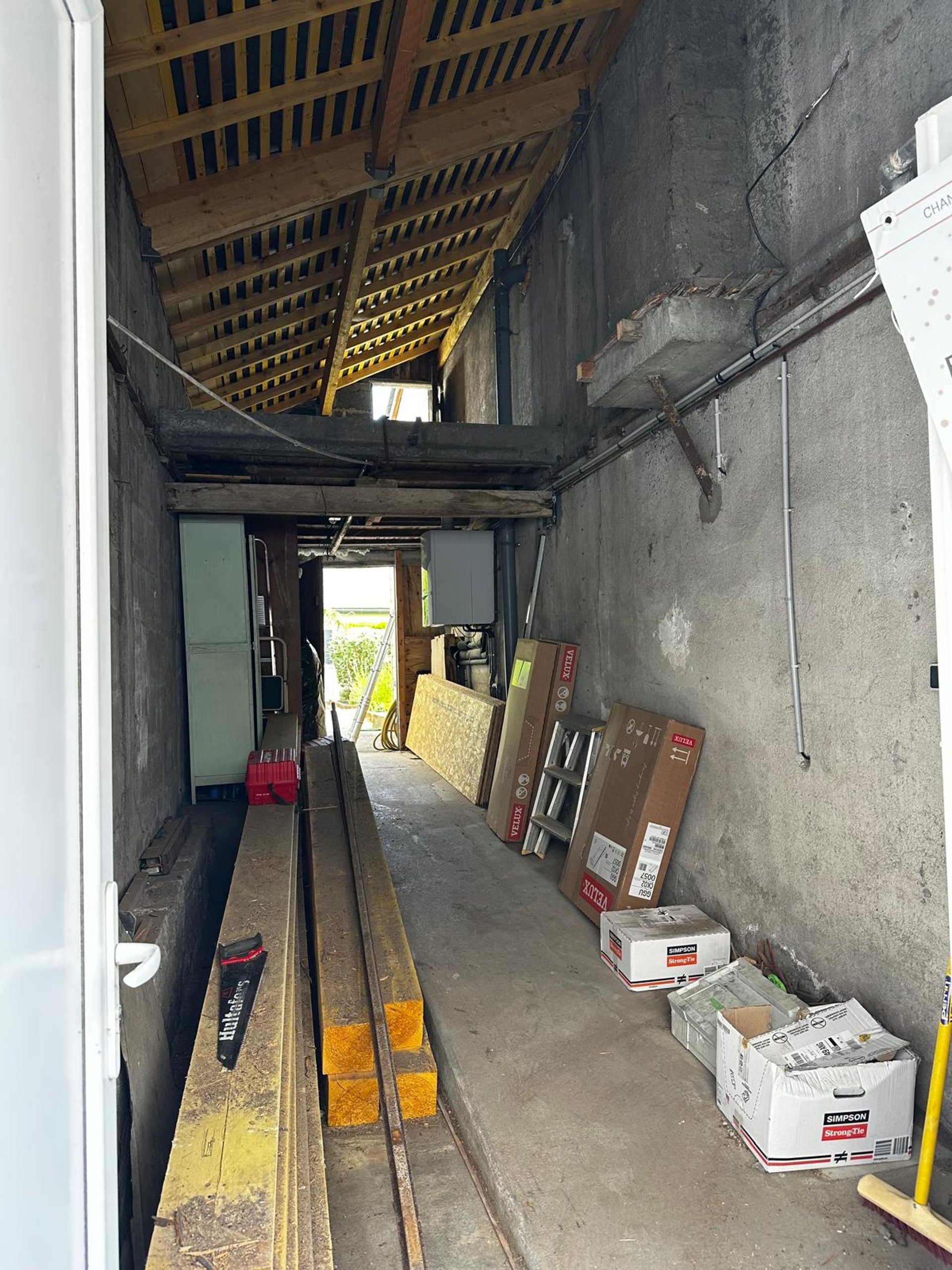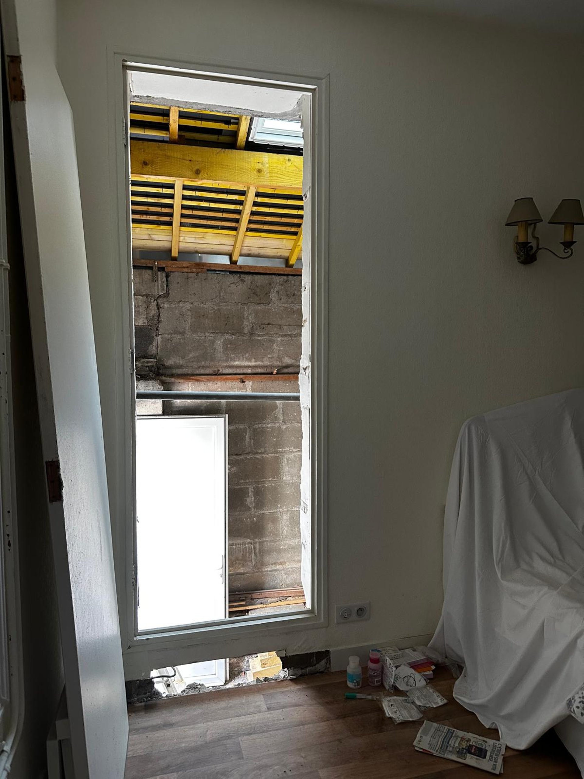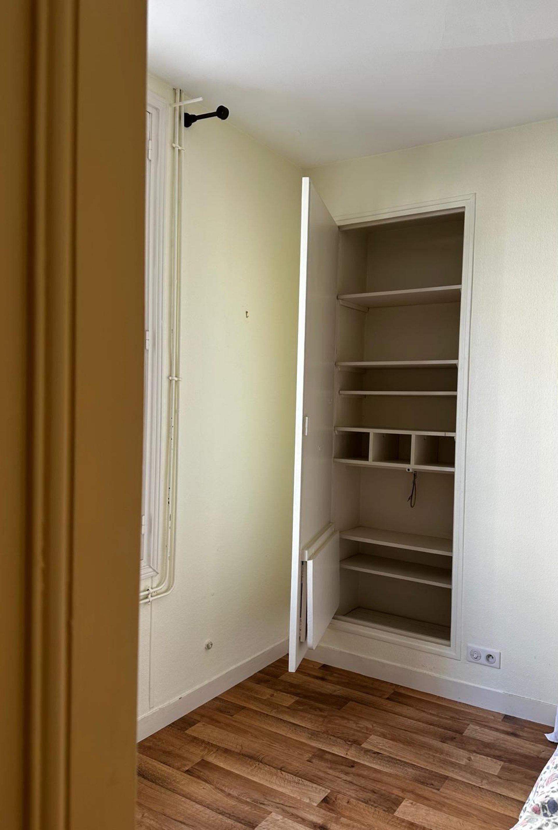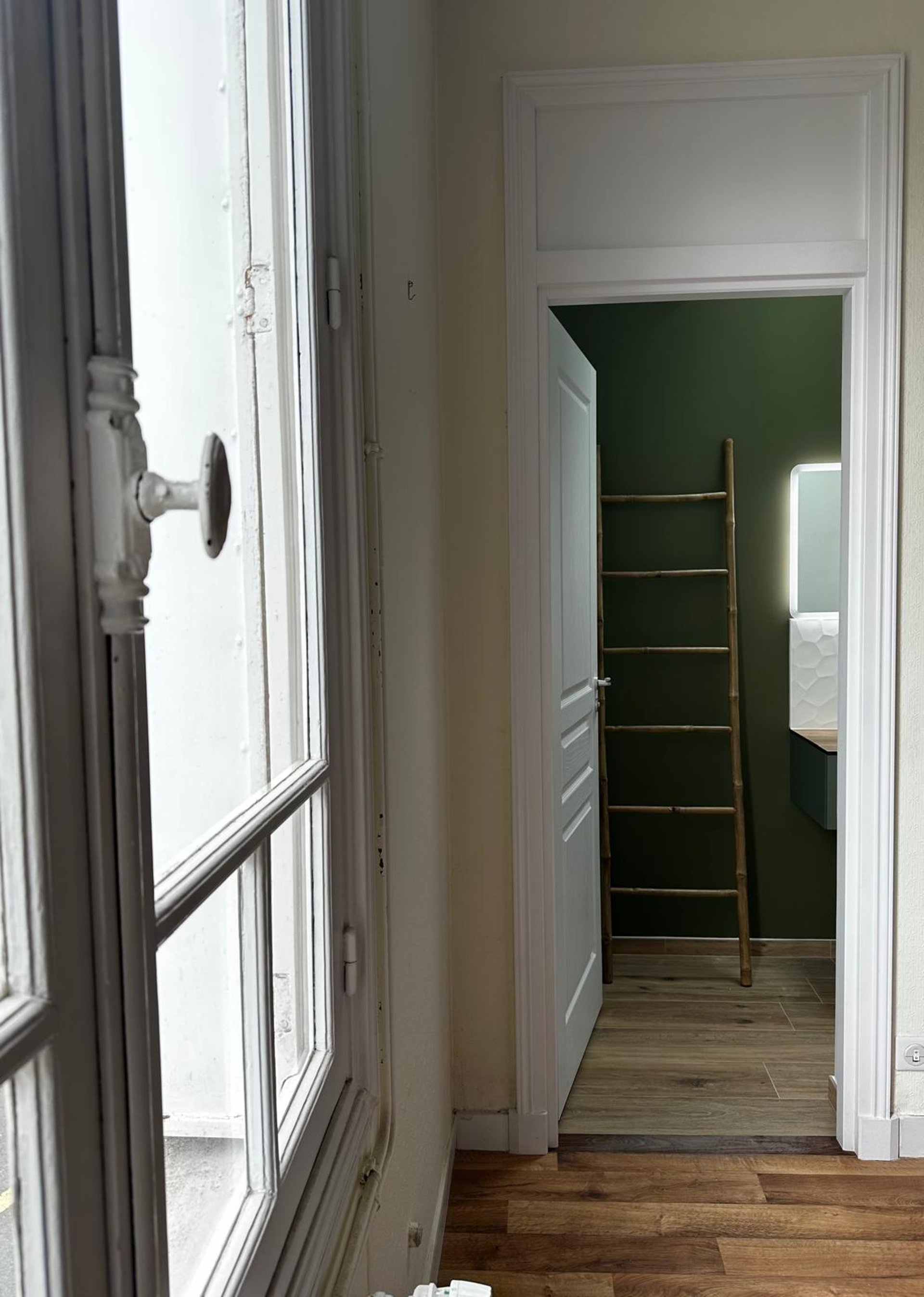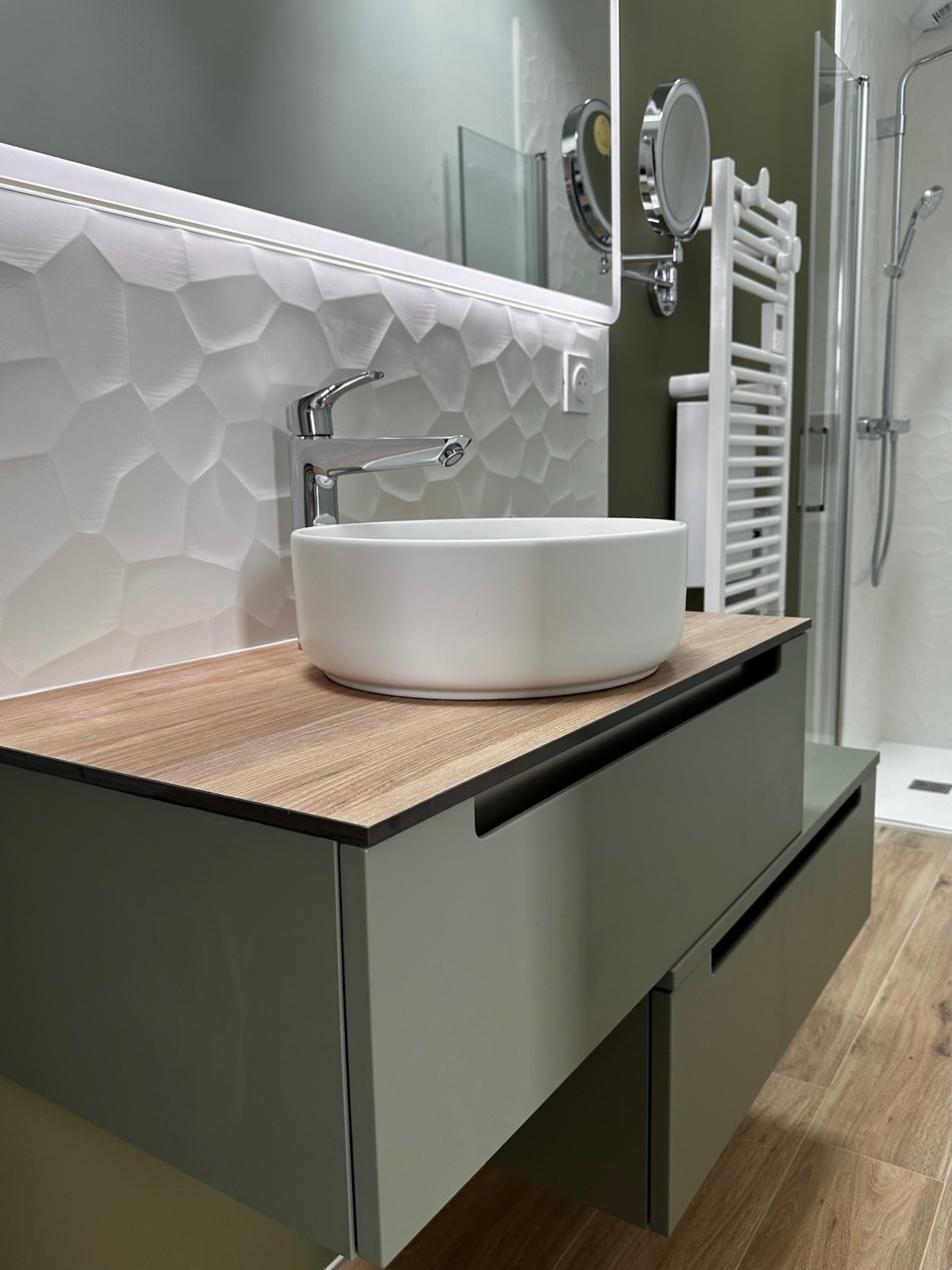 Une pièce inexistante a été entièrement créée pour accueillir une salle de bain moderne et lumineuse. L’espace a été conçu sur mesure, avec un aménagement fonctionnel et une ambiance naturelle mêlant vert olive, bois clair et blanc texturé. Une ancienne armoire a été ingénieusement transformée en ouverture, offrant un accès harmonieux à cette nouvelle pièce d’eau.
